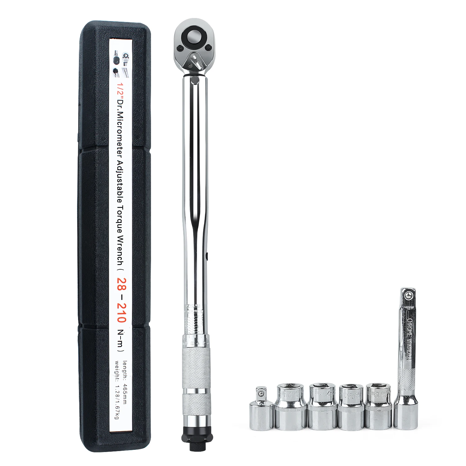 1/2 conjunto de torque vem com 1/2 'de barra de extensão e adaptador 3/8 "". Como quatro tiradas são 17mm/0,67 polegadas, 19mm/0,75 polegadas, 21mm/0,83 polegadas e 23mm/0,91 polegadas, cuidadosamente. Todas as peças são embaladas em caixas de ferramentas.